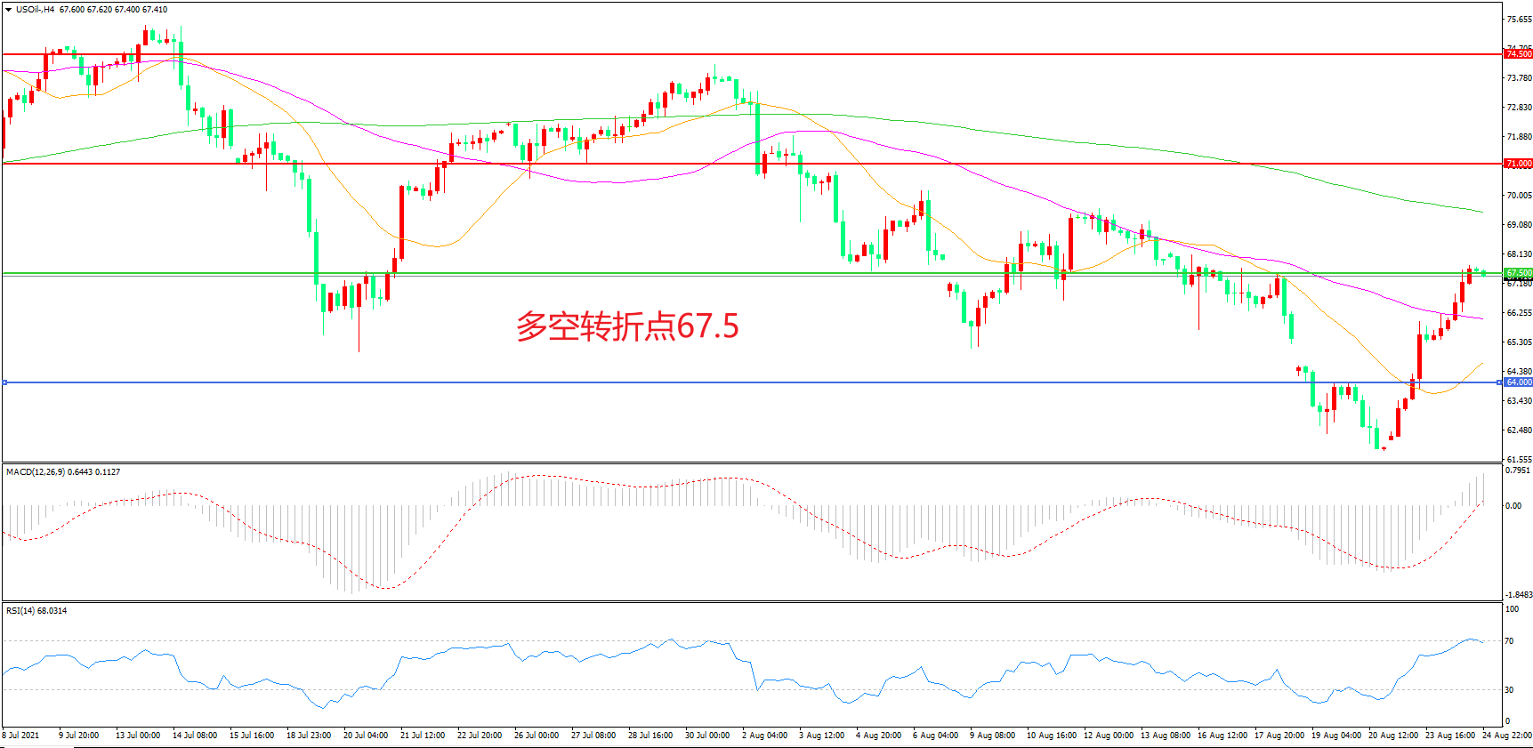 交易策略:在67.50之上看涨,目标71.00 74.50
