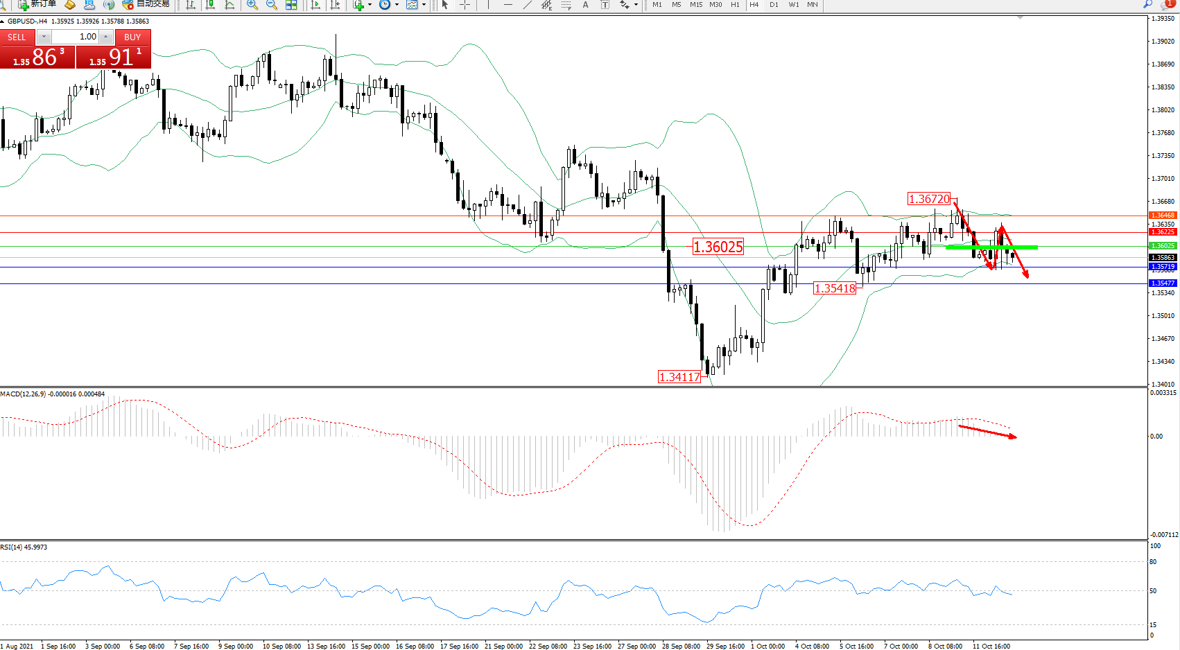 交易策略:1.36025下方看跌,目标1.35719、1.35477