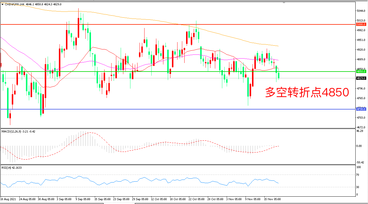 4小时图看,沪深300高位震荡后再次跌破4850,反弹趋势受到破坏,55均线成为上方阻力,4850成为多空分水岭,MACD红柱减少,RSI指标走平,日内弱势震荡概率较大。
