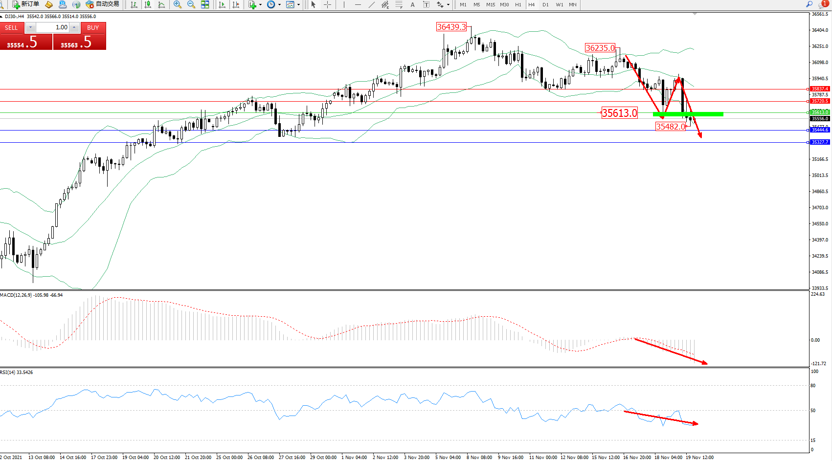 技术点评:空头动力延续布林带指标中下轨区间持续震荡下行,低位抵达35482位置后有继续下行迹象,布林带指标呈张口走势持续中,MACD指标处于空头区域维持整理持续下行,RSI指标处于空头区域维持震荡不断下移;
