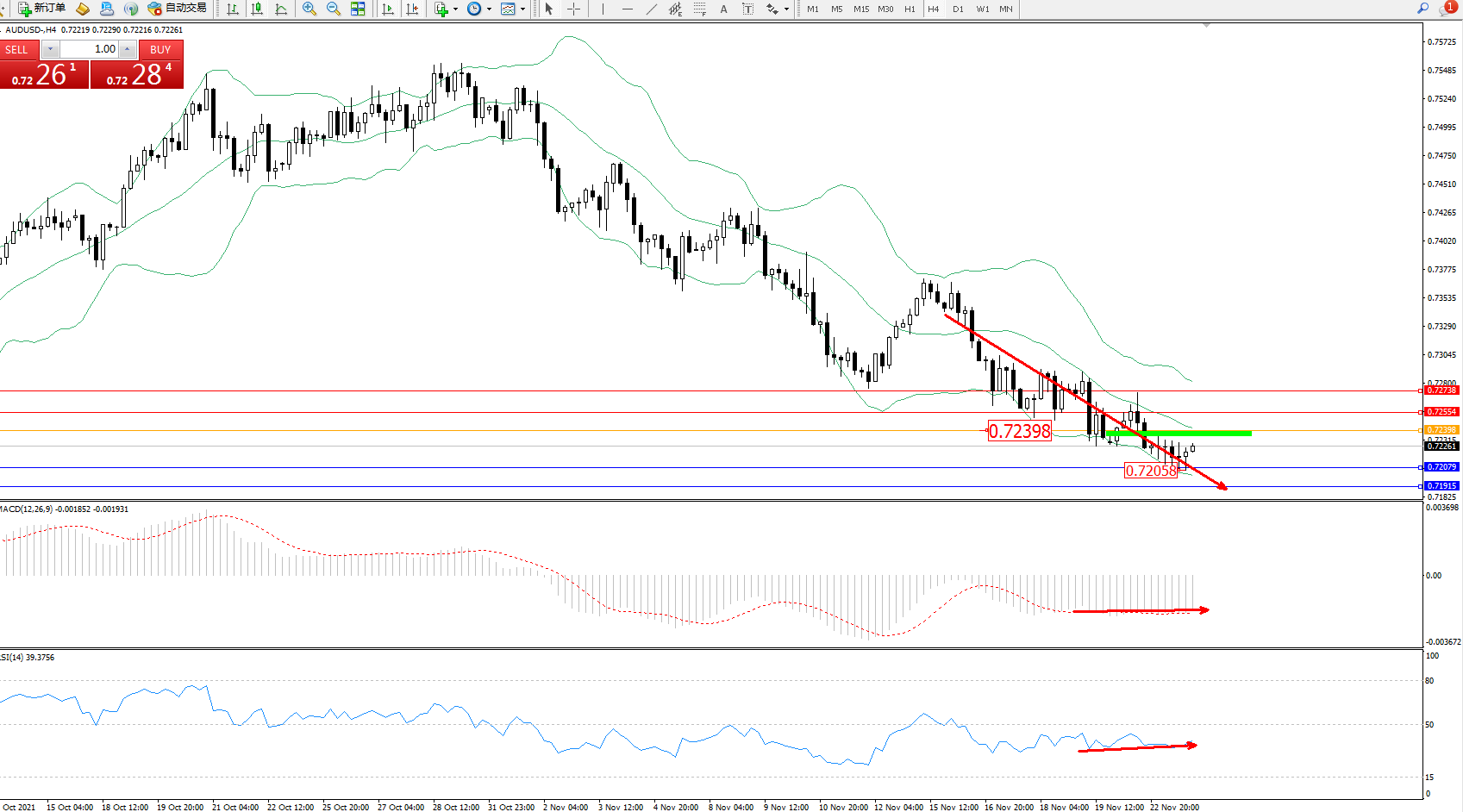 交易策略:0.72398下方看跌,目标0.72079、0.71915