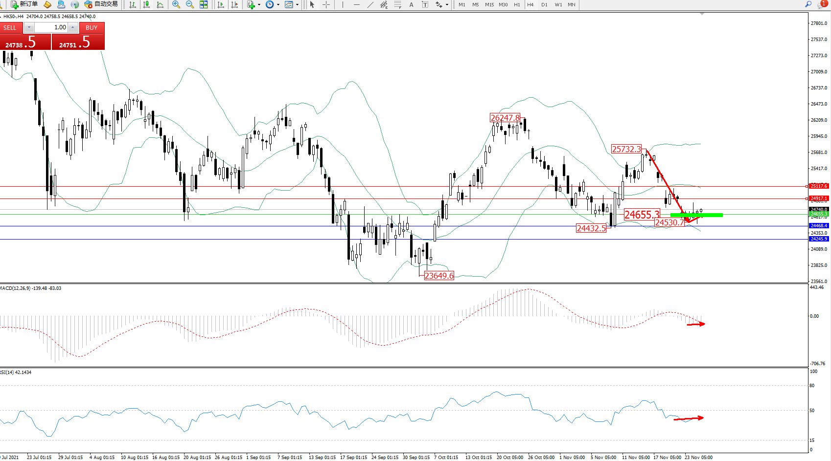恒指HK50 ——4小时K线图显示:
