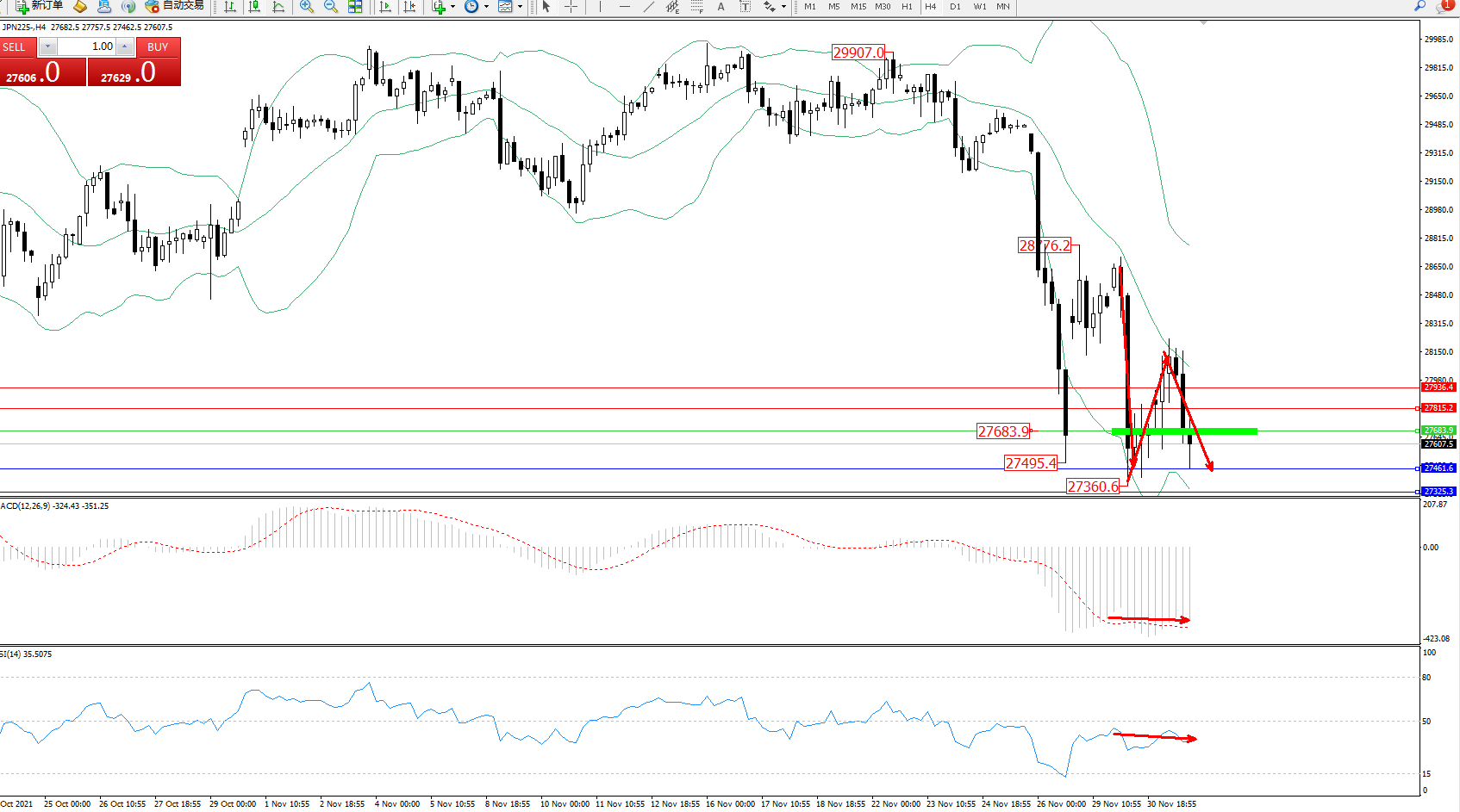 日经指数JPN225——4小时K线图显示: