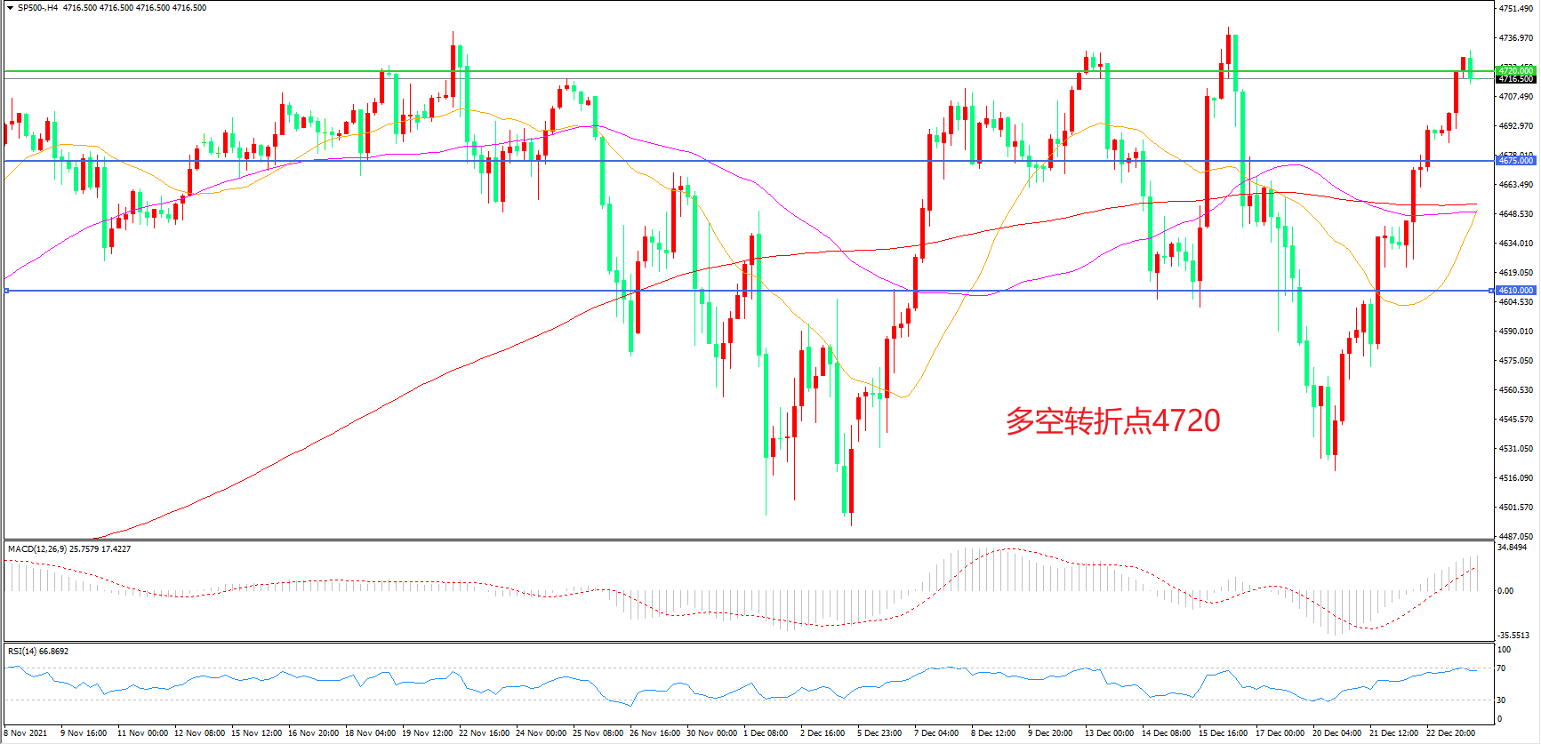 4小时图看,标普500长阳拉升,短线走势有所回暖,均线系统粘合形成下方支撑,4720成为多空分水岭,MACD红烛增加,日内震荡上行概率较大。