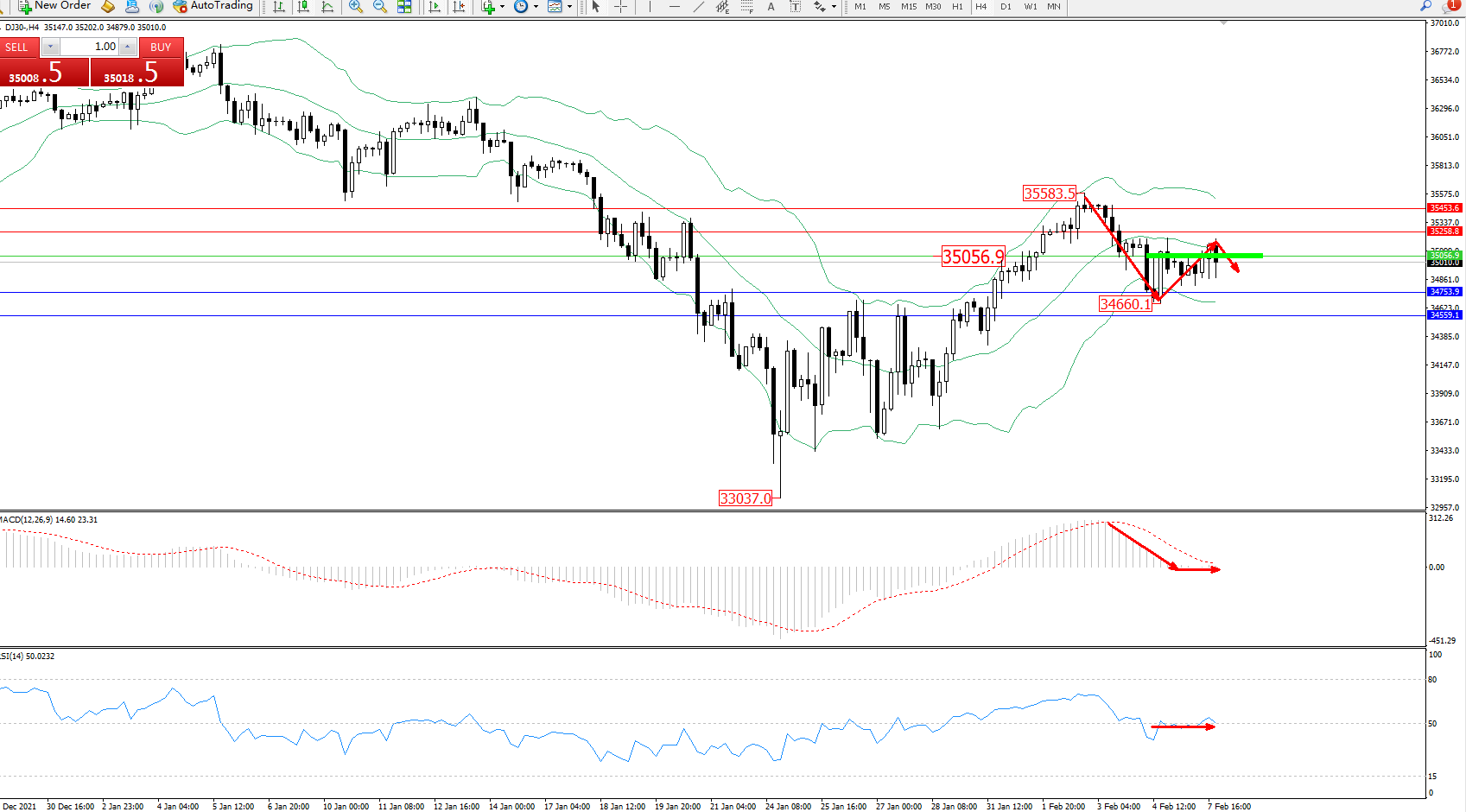交易策略:35056下方看跌,目标34753、34559
