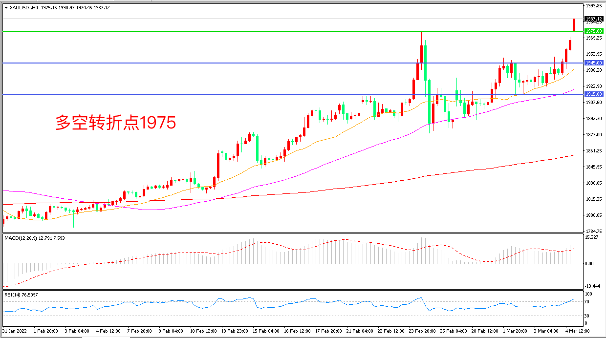 4小时图看,金价跳空高开,短线走势偏强,1975成为多空分水岭,1945成为下方支撑,MACD红柱增加,RSI指标走平,日内震荡上行概率较大。