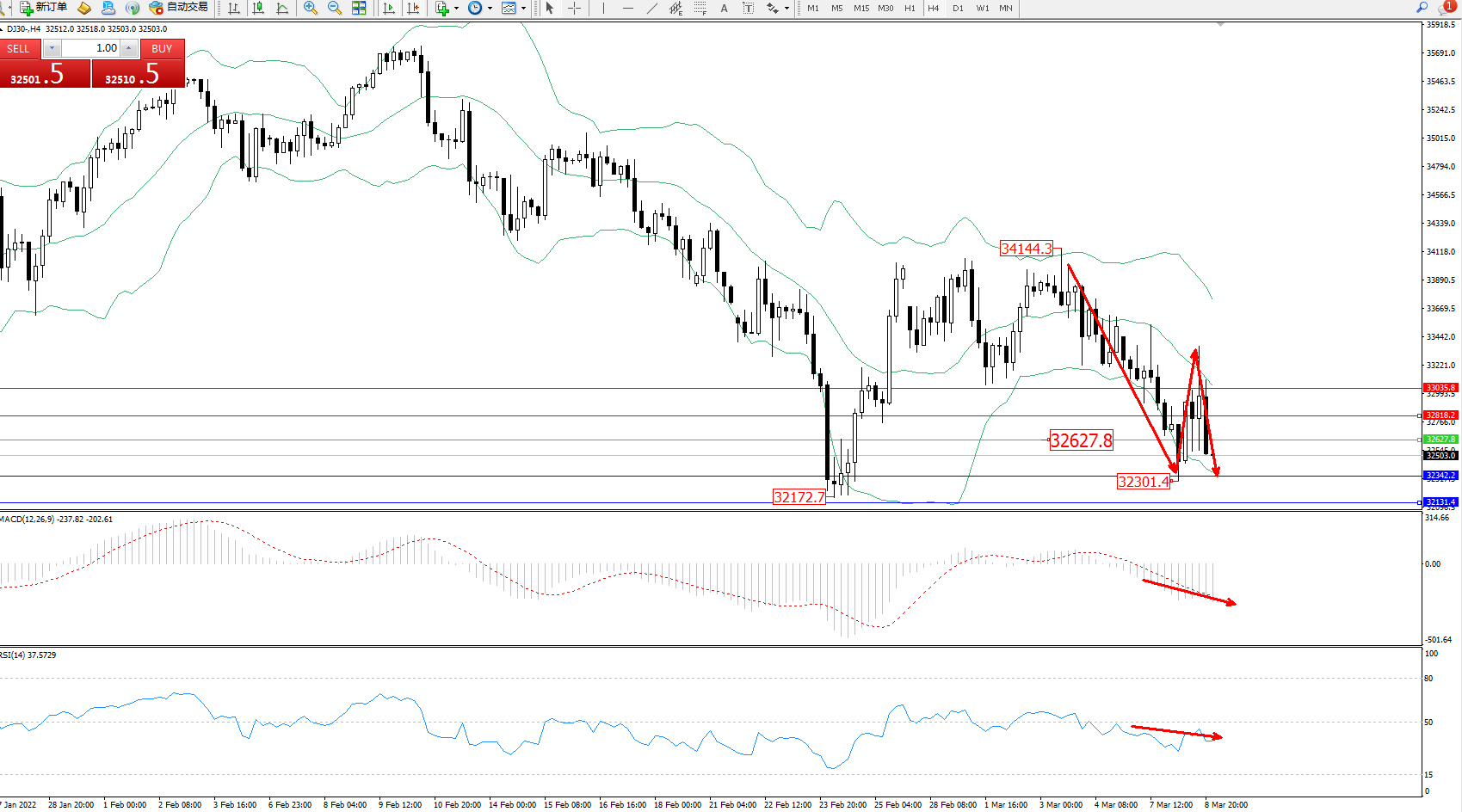 技术点评:空头动力延续布林带指标通道中下轨区间持续震荡下挫,低位抵达32301位置附近得到短期支撑强势上移,但市场整体下行趋势态势良好,空头动力再度下挫,布林带指标呈向下移动趋势走势持续中,MACD指标处于空头区域维持整理平移,RSI指标处于空头区域窄幅震荡中;