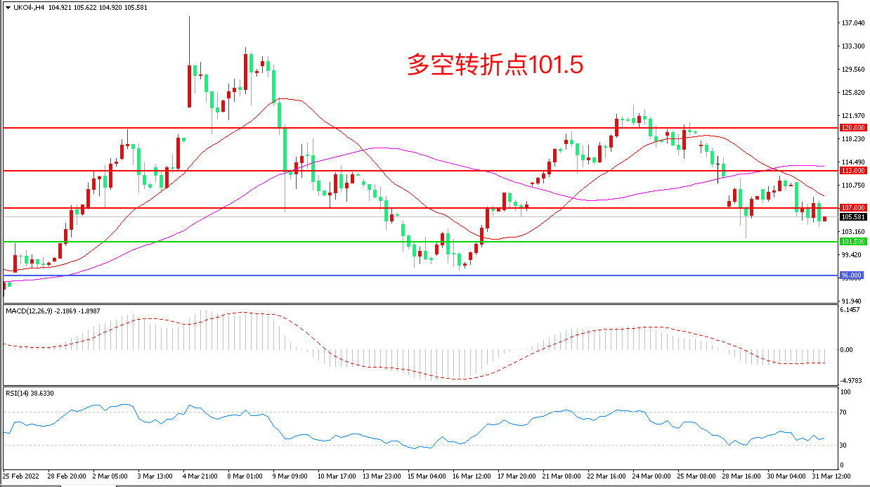 4小时图看,油价触碰21周期均线后再度回落,短线走势低迷,107美元成为上方阻力,101.5美元成为多空分水岭,MACD绿柱缩短,RSI指标走平,日内延续震荡概率较大。