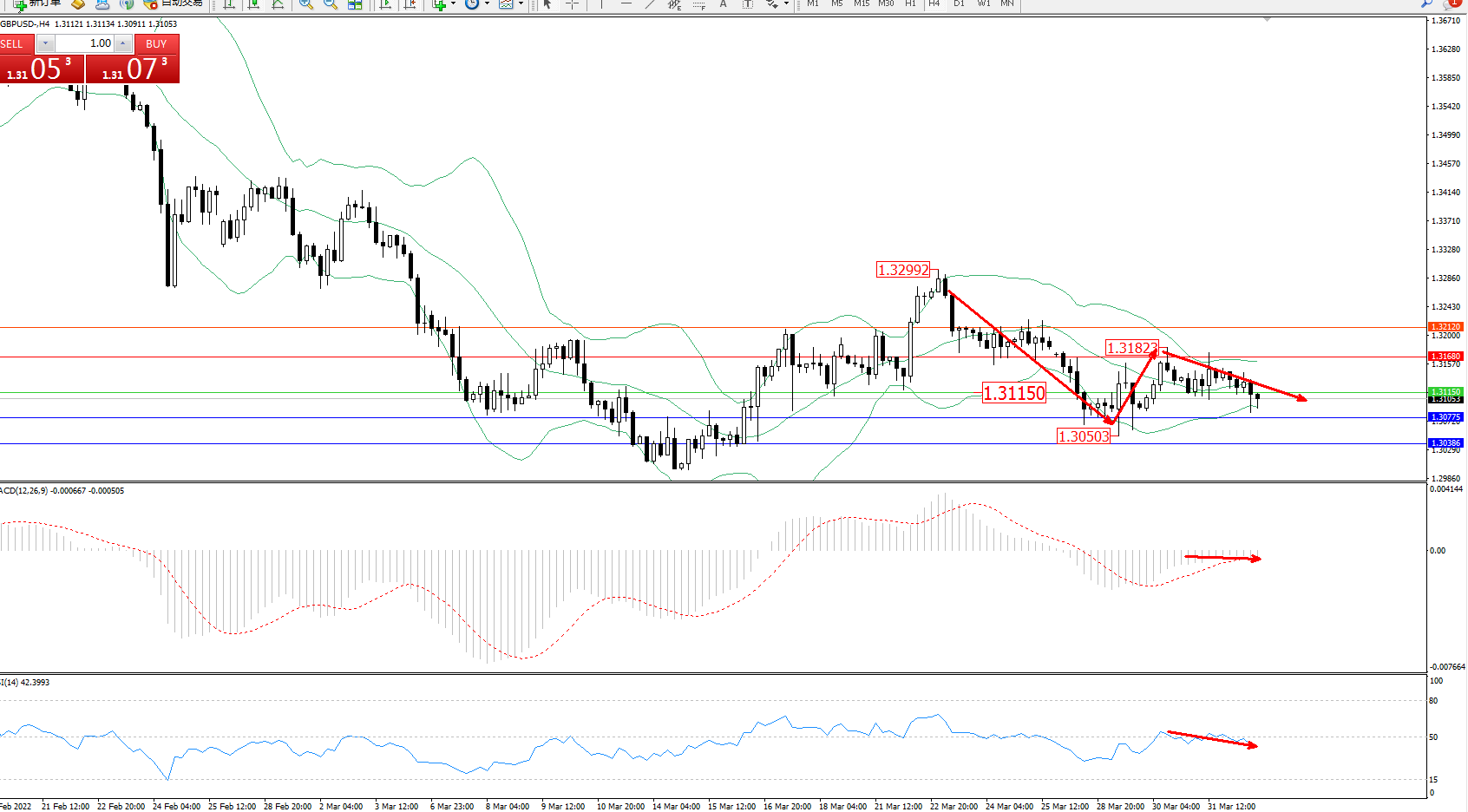 交易策略:1.31150下方看跌,目标1.30775、1.30386