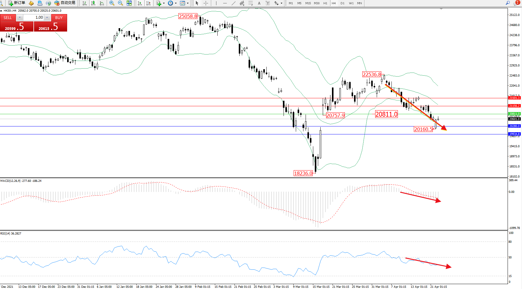 恒指HK50 ——4小时K线图显示:
