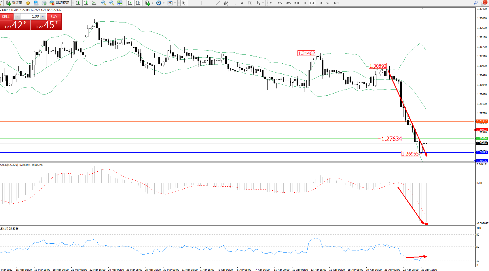 交易策略:1.27634下方看跌,目标1.27013、1.26626