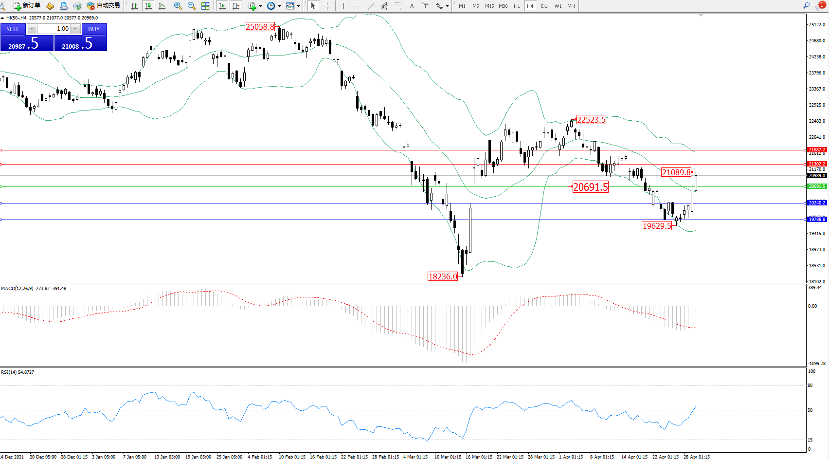 恒指HK50 ——4小时K线图显示: