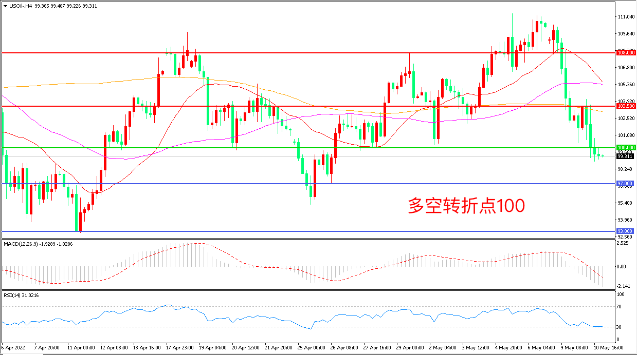 周二(5月10日),对全球经济复苏失速和需求疲软的担忧,叠加美元重新走强,令油价在美盘时段跌幅迅速放大,美国WTI原油快速下跌,收报99.30美元/桶。美国能源信息署在刚刚发布的短期能源报告中下调了中美两国的消费增长预期,如果其他两大机构的预测与此一致,可能会对再次油价形成冲击。