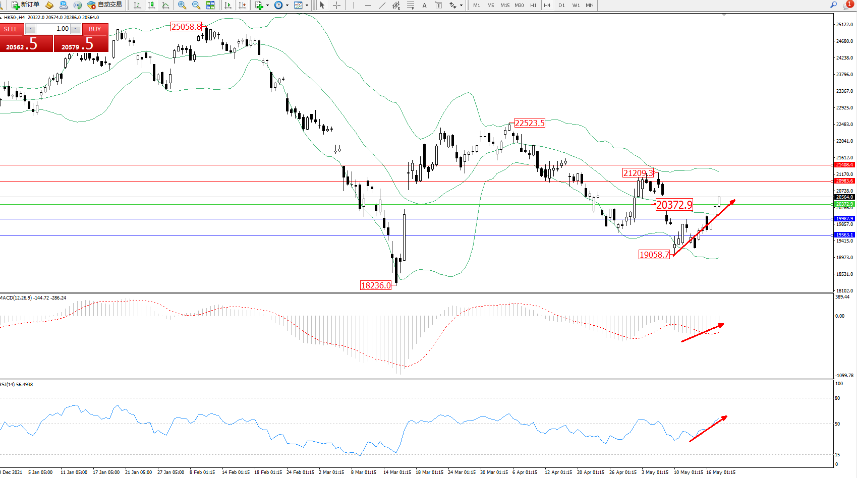 恒指HK50 ——4小时K线图显示: