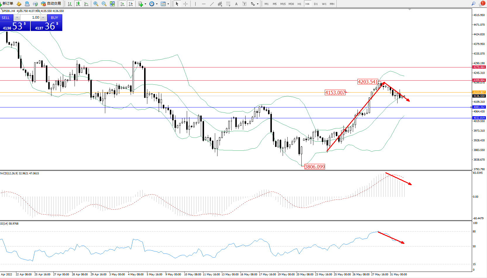 标普500指数5月31日(周二)收盘下跌21.84点,跌幅0.53%,报4136.40点;据CME“美联储观察”:美联储到6月份加息25个基点的概率为0%,加息50个基点的概率为97.9%,加息75个基点的概率为2.1%。