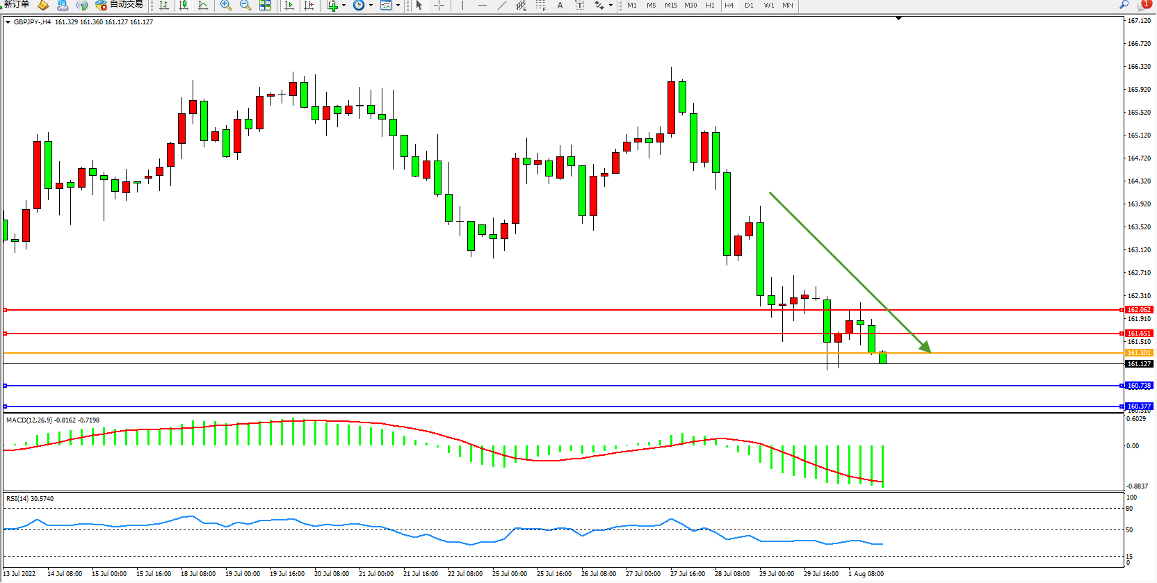 交易策略:161.301下方看跌,目标160.738、160.377