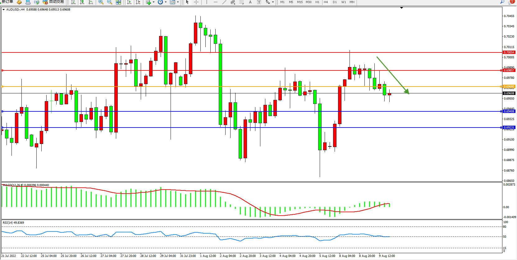 交易策略:0.69680下方看跌,目标0.69408、6.09231