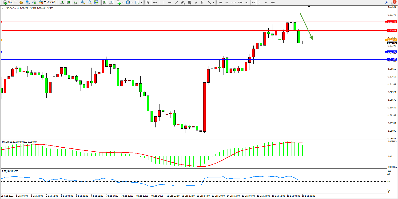美元加元USDCAD——4小时K线图显示: