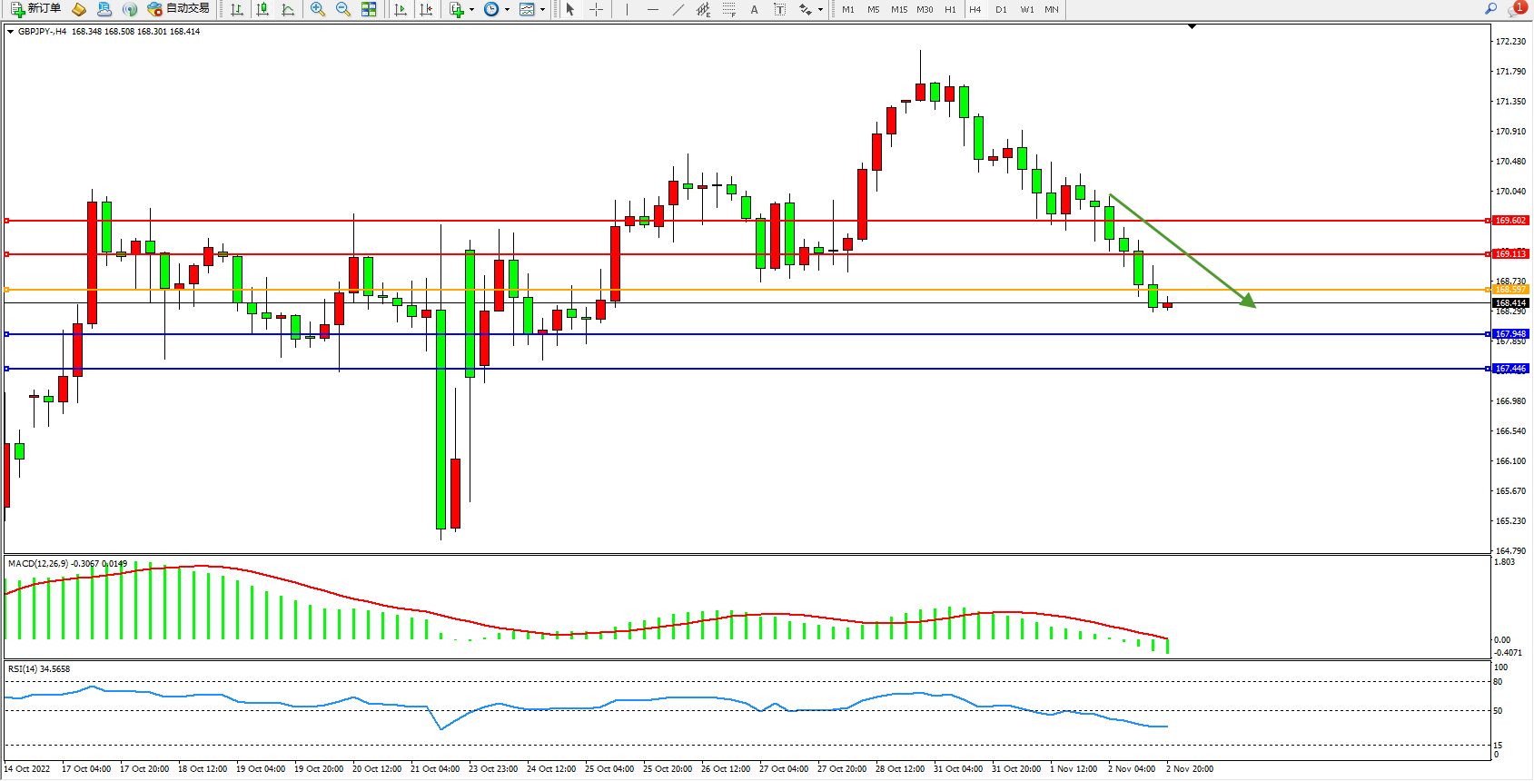 交易策略:168.597下方看跌,目标167.948、167.446