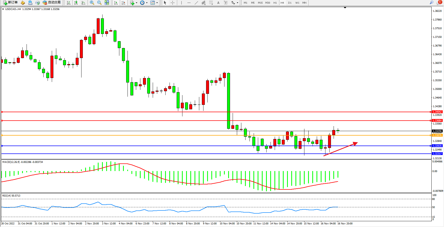 美元加元USDCAD——4小时K线图显示: