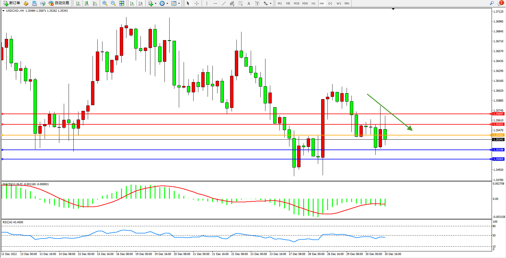 美元加元USDCAD——4小时K线图显示: