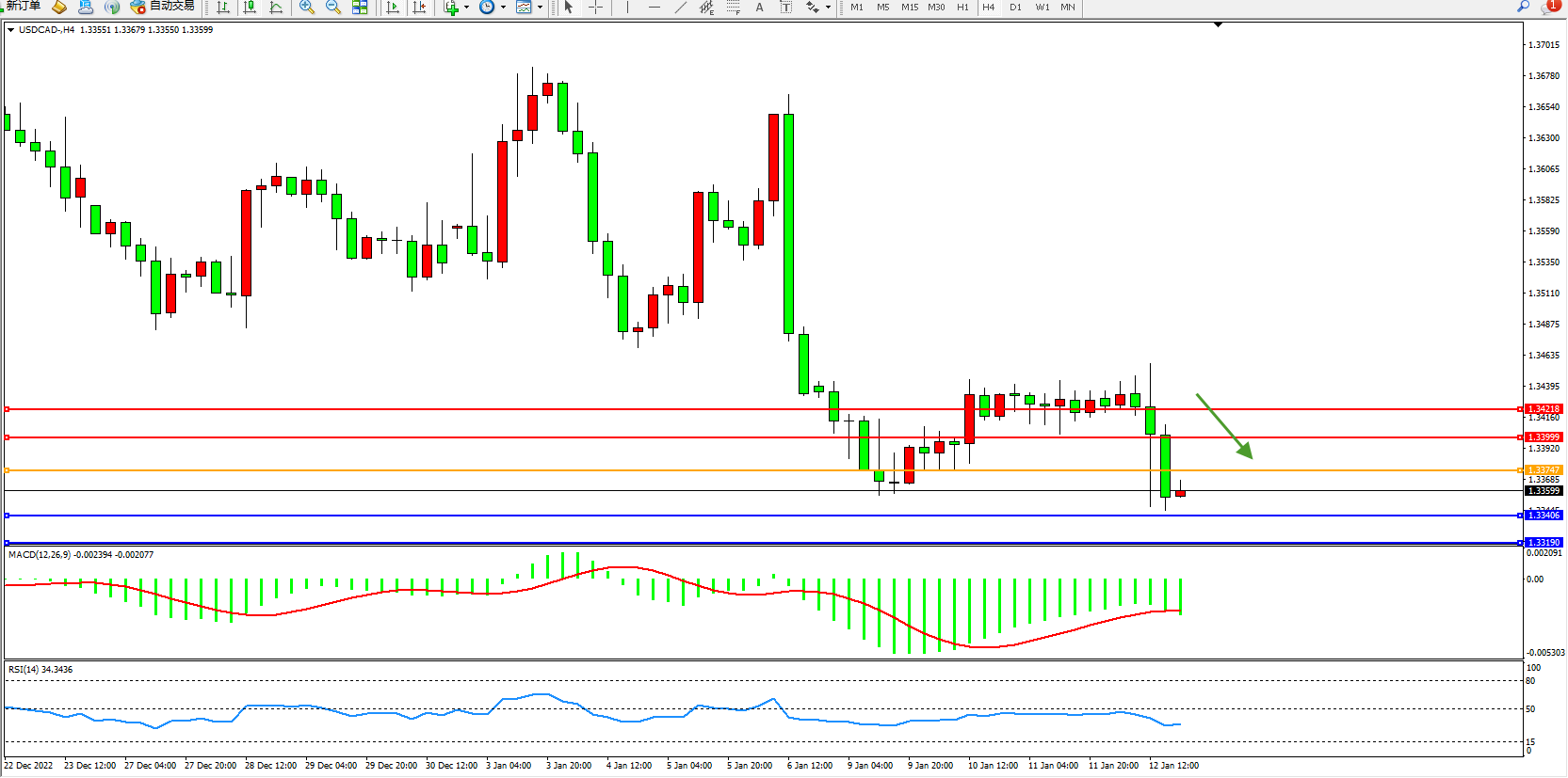 美元加元USDCAD——4小时K线图显示: