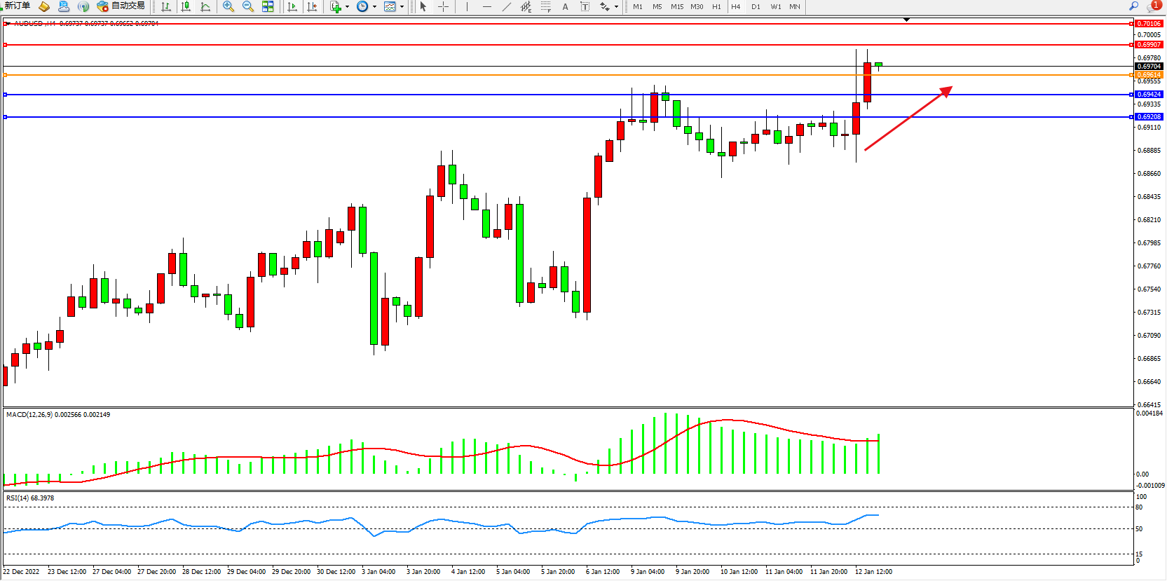 交易策略:0.69614上方看涨,目标0.69907、0.70106
