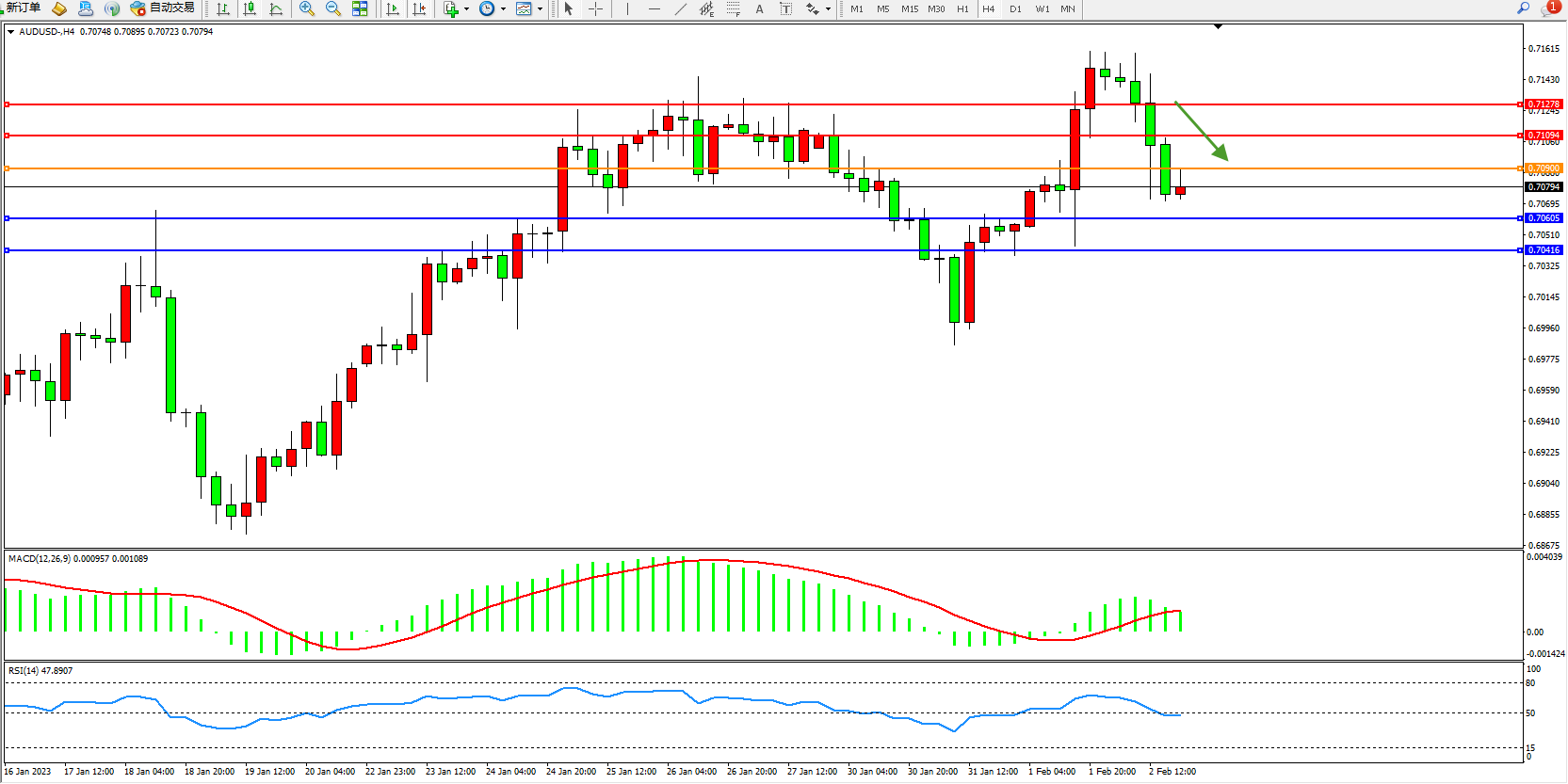交易策略:0.70900下方看跌,目标0.70605、0.70416