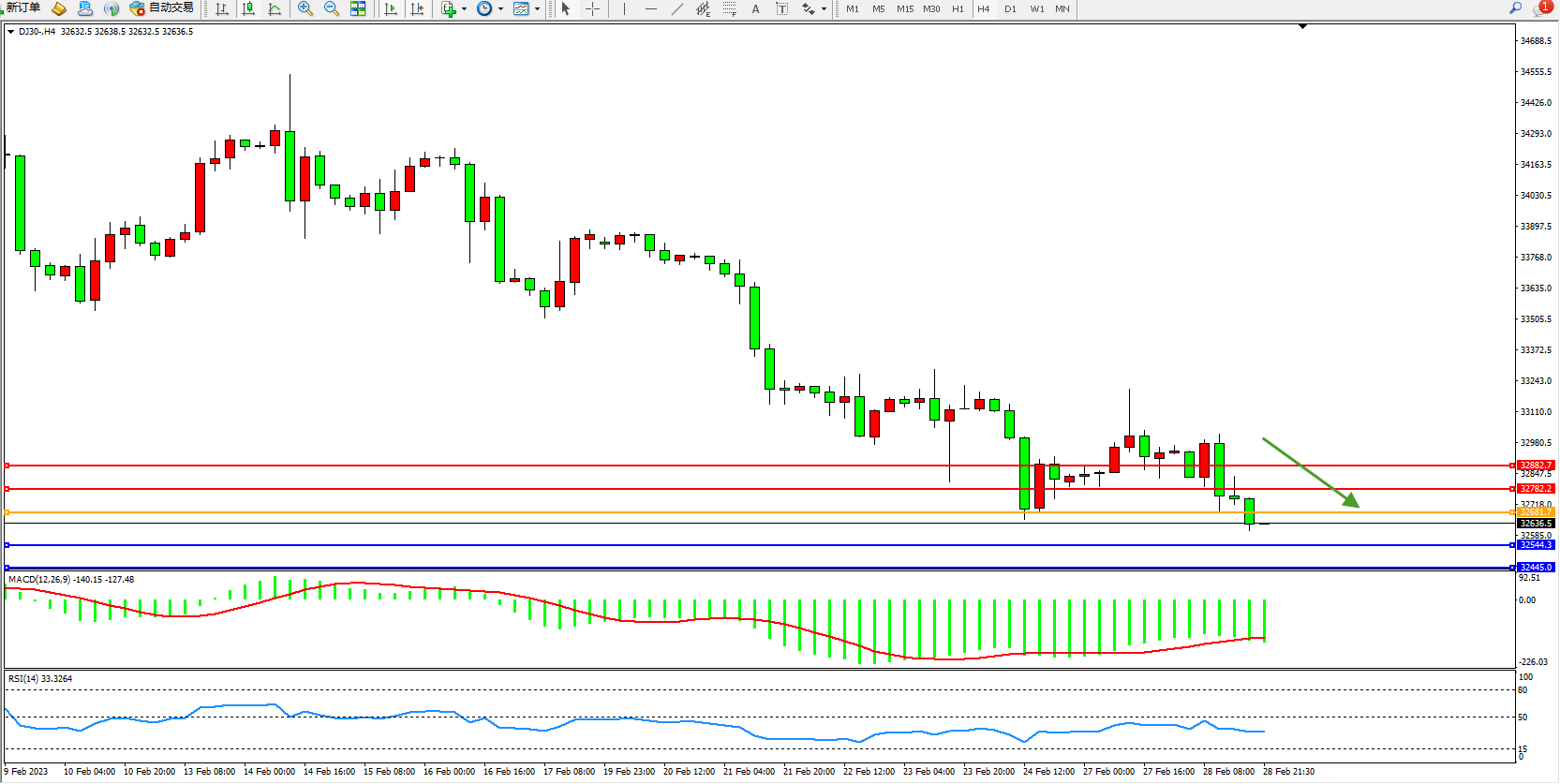 道琼斯指数DJ30——4小时K线图显示: