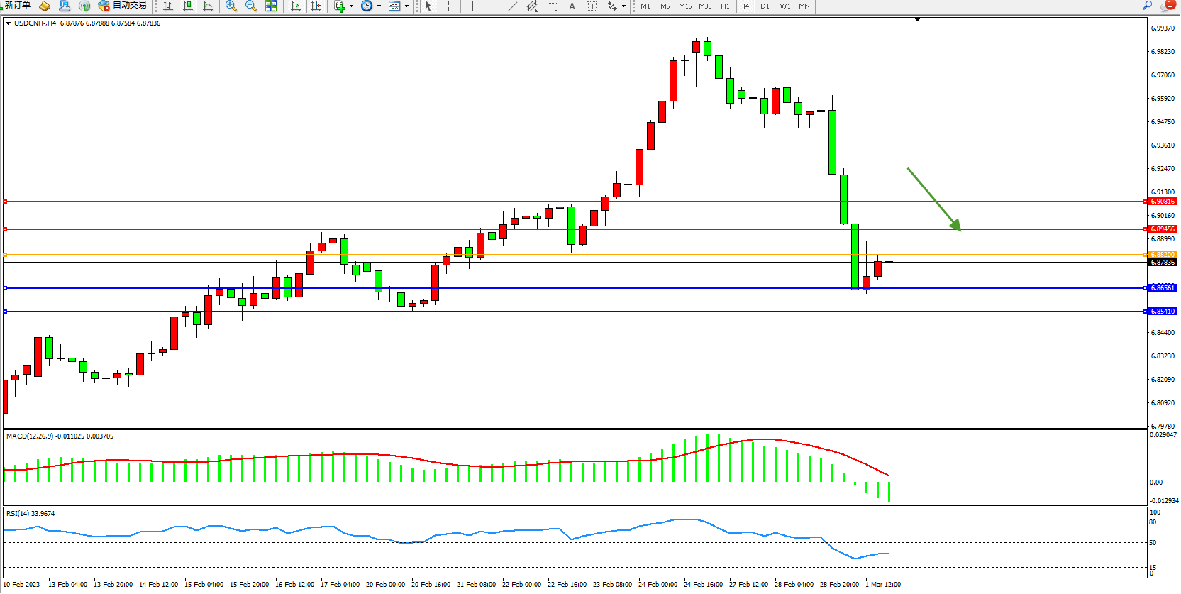 美元人民币USDCNH——4小时K线图显示: