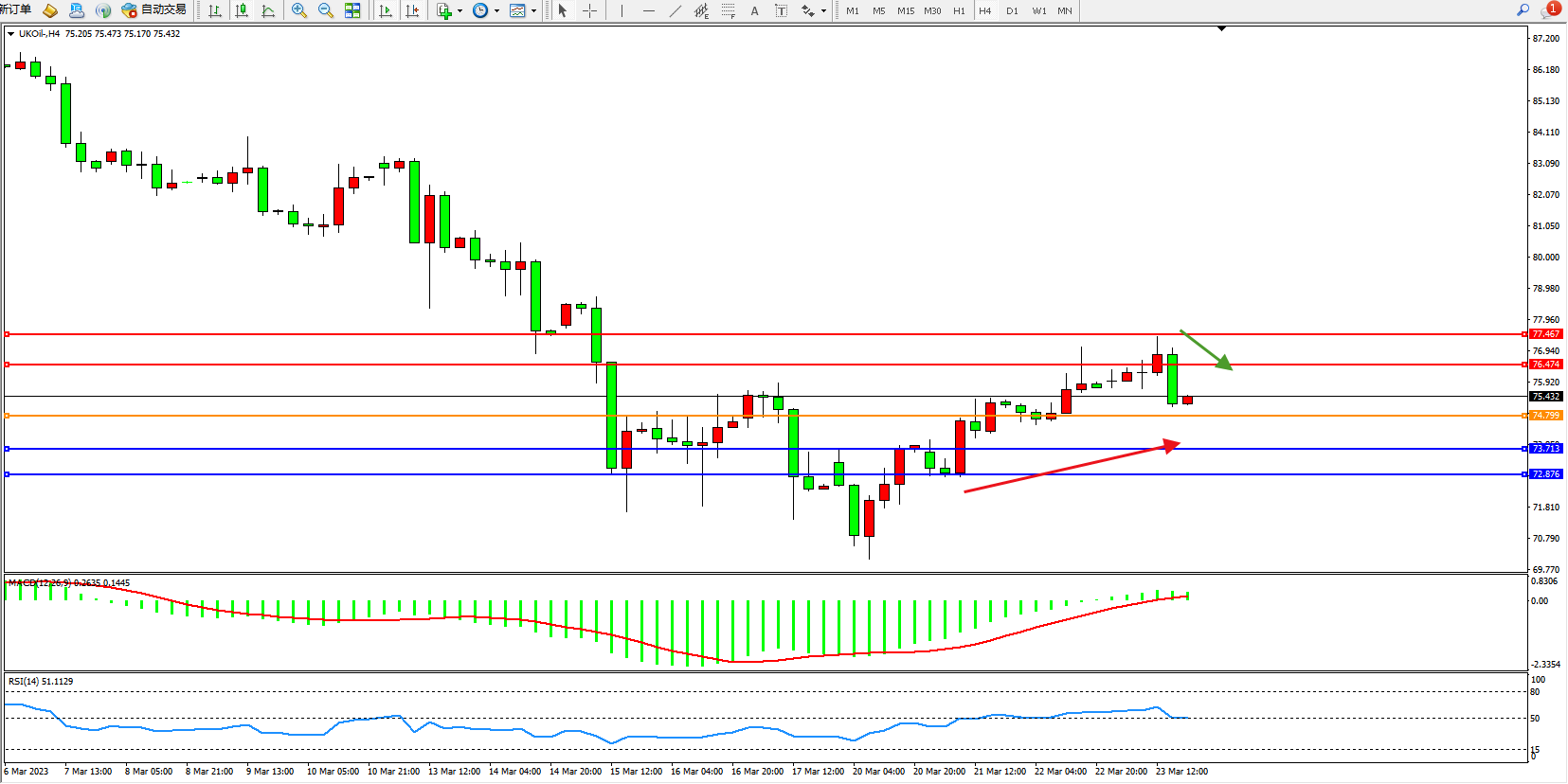 交易策略:74.799上方看涨,目标76.474  77.467