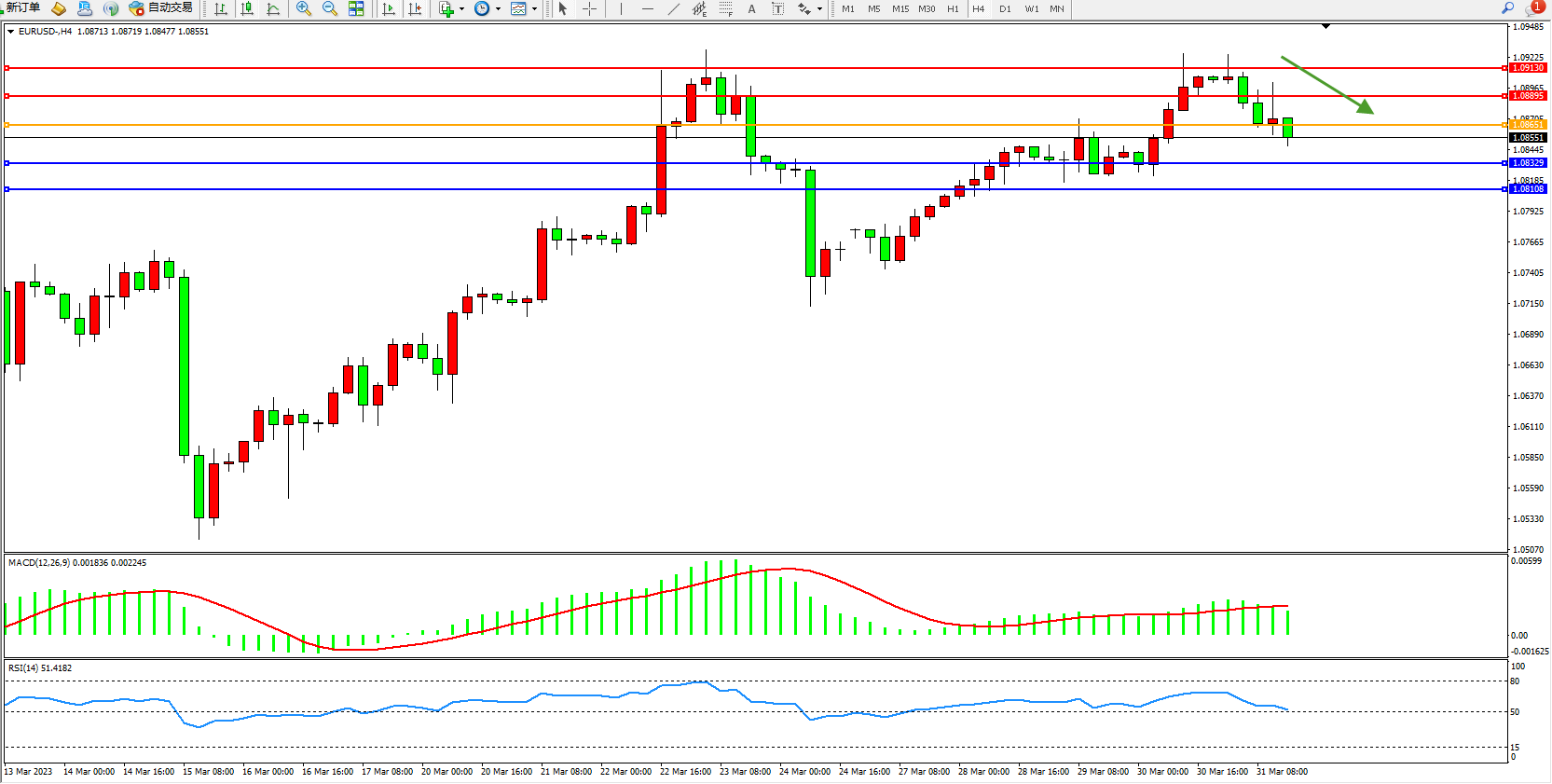 欧元美元EURUSD—4小时K线图显示: