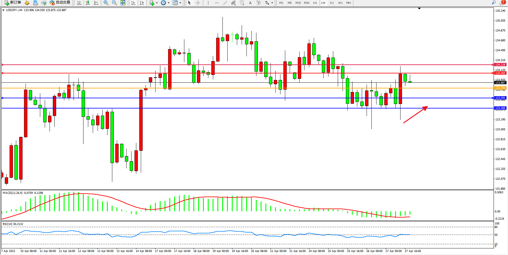 备选策略:133.780下方看跌,目标133.591 133.400