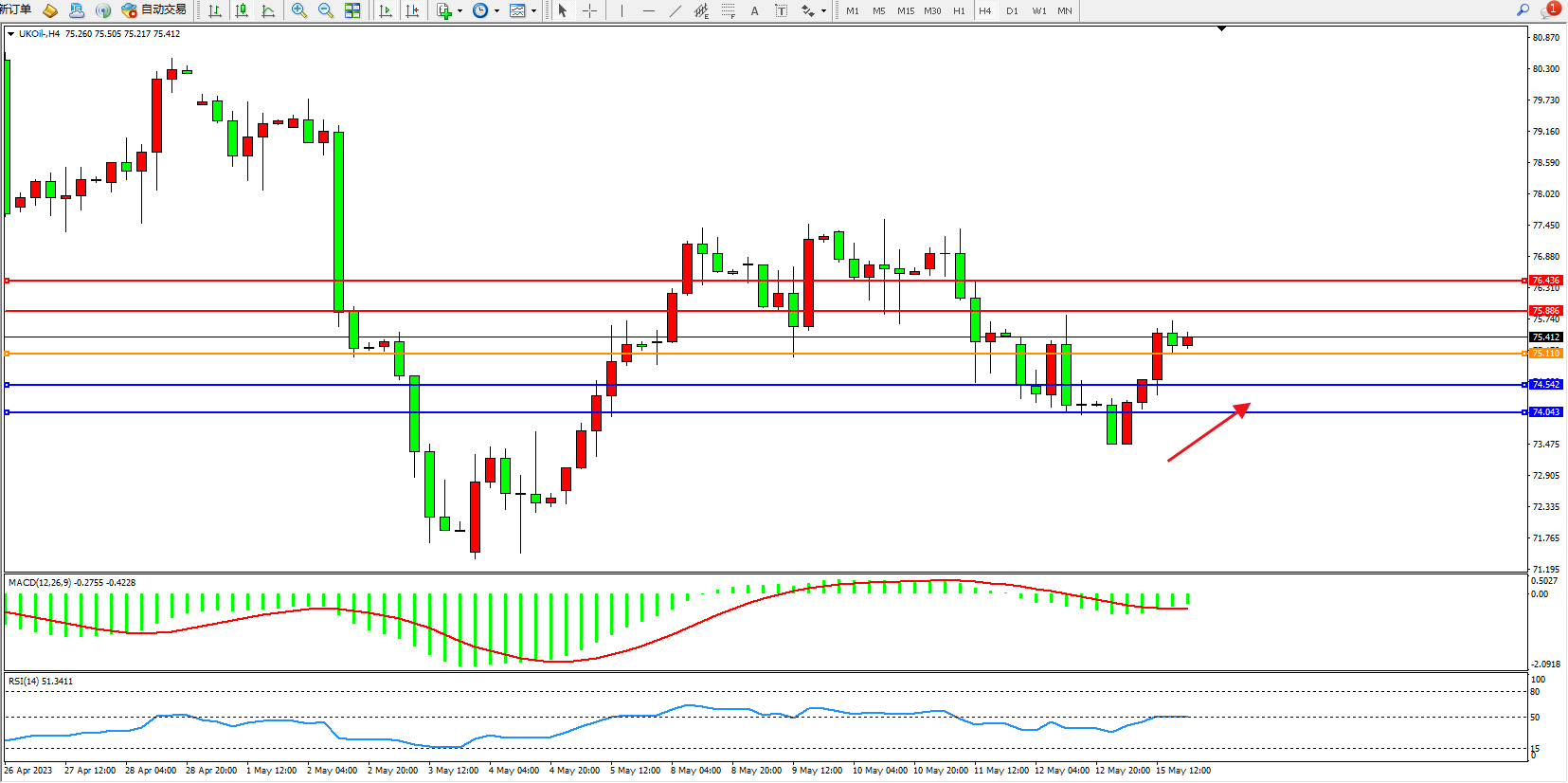 交易策略:75.110上方看涨,目标75.886  76.436