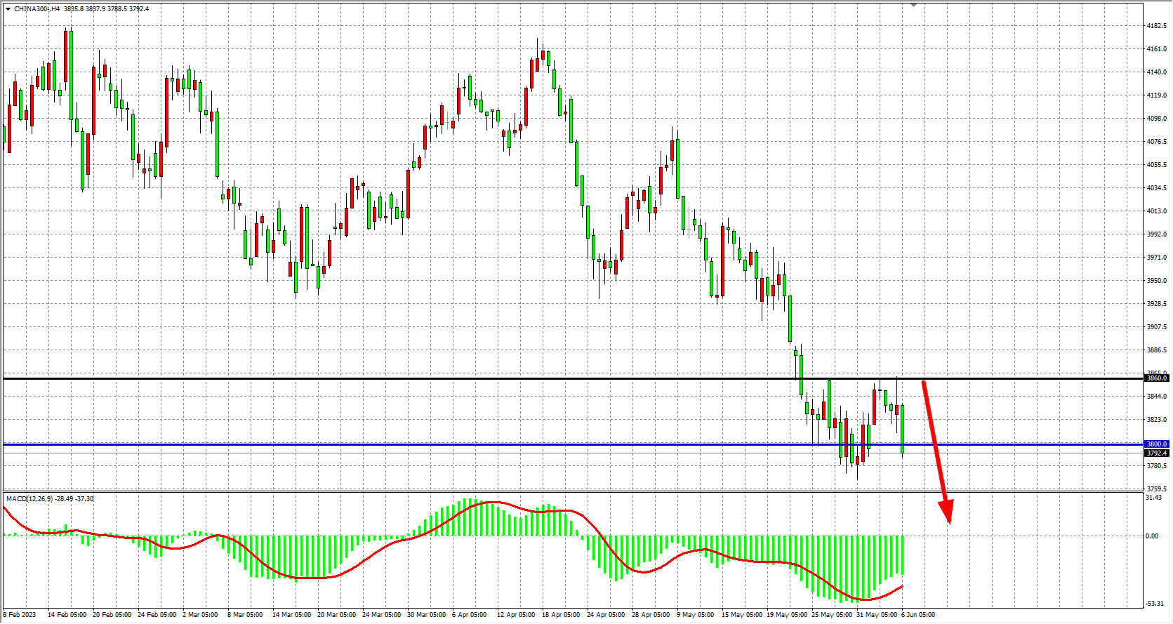4小时图看,沪深300反弹3860再度有效受阻,MACD量能在零轴下再度放大,趋势仍处于下行趋势,在3860之下继续看跌,目标3760-3700。