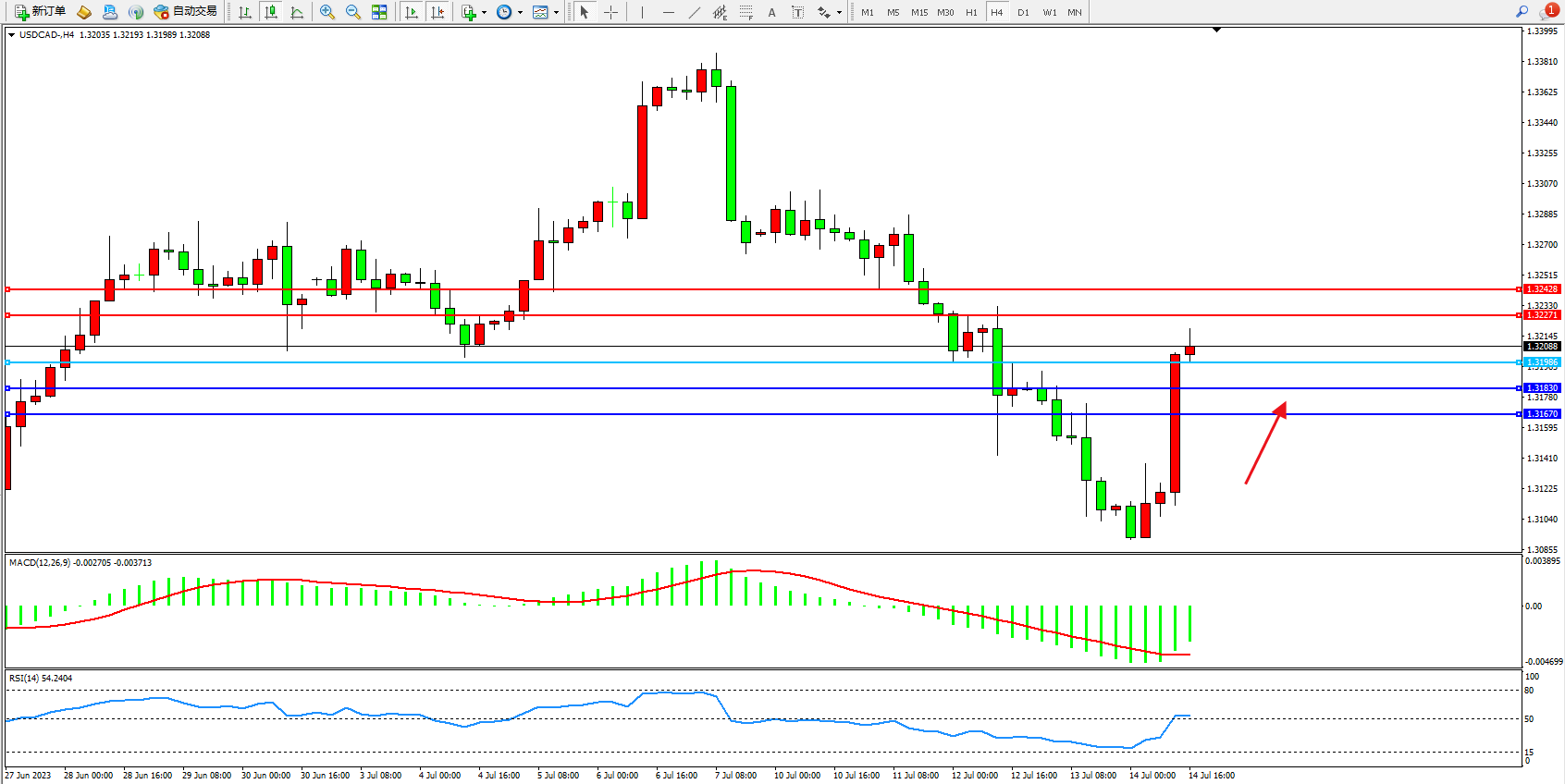 美元加元USDCAD——4小时K线图显示: