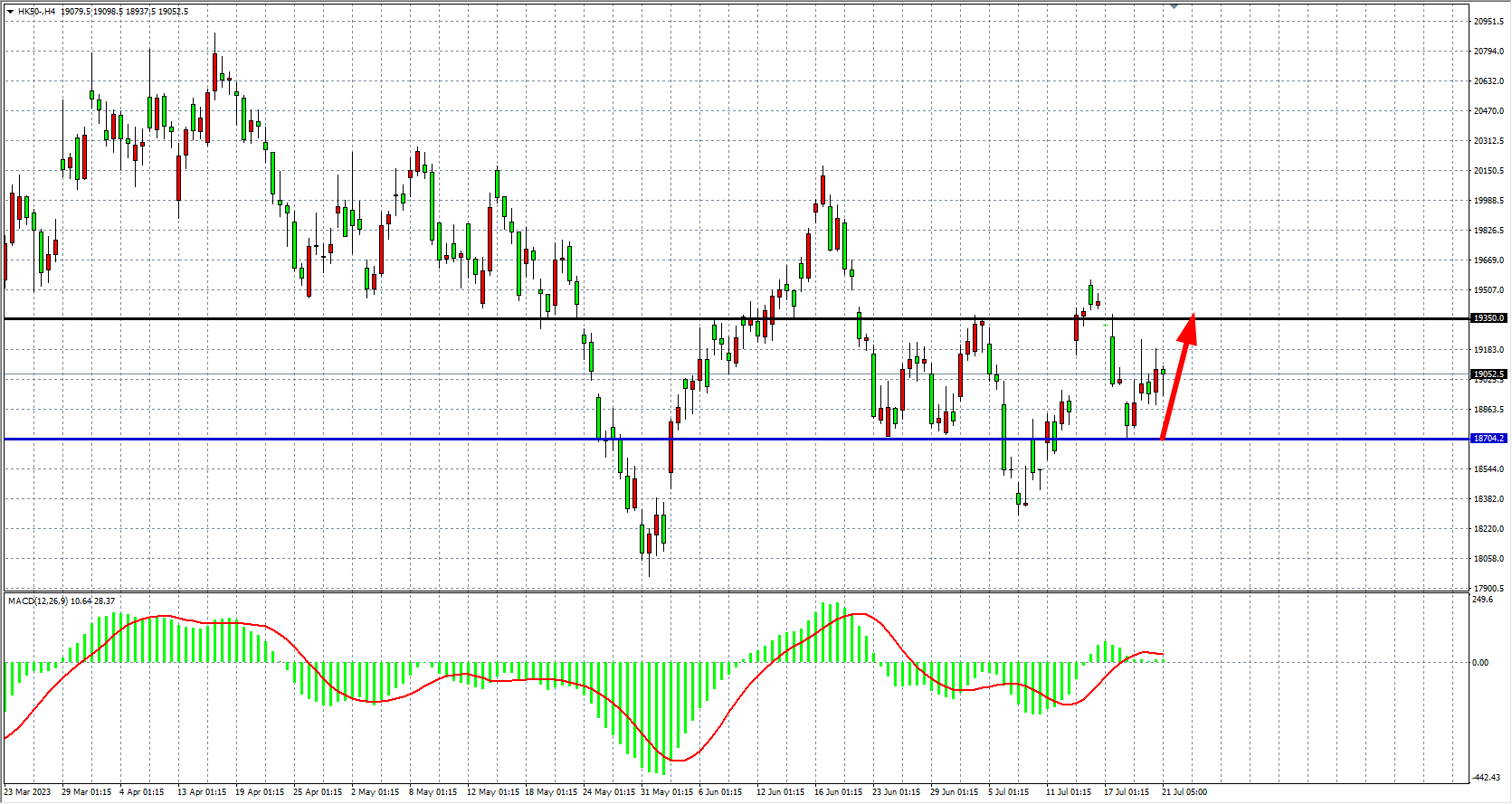 4小时图看,恒指在19000关口附近盘整,MACD量能在零轴上缩量,上方关注19350的阻力,下方关注18700支撑。