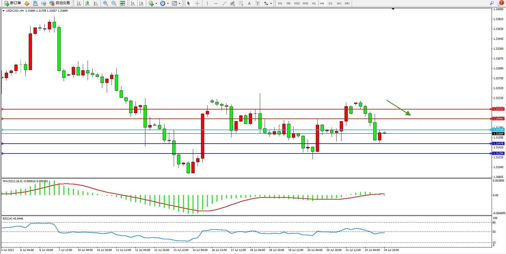 美元加元USDCAD——4小时K线图显示: