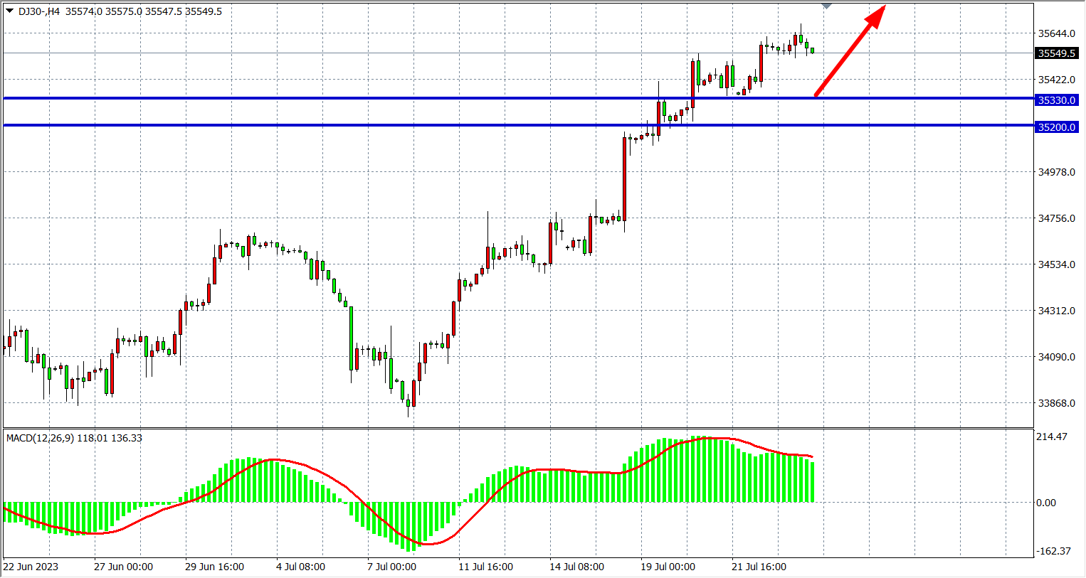 4小时图看,道指维持在35500之上,MACD量能维持零轴上放量,多头趋势强劲,支撑关注35330-35200附近,阻力35700-36000。