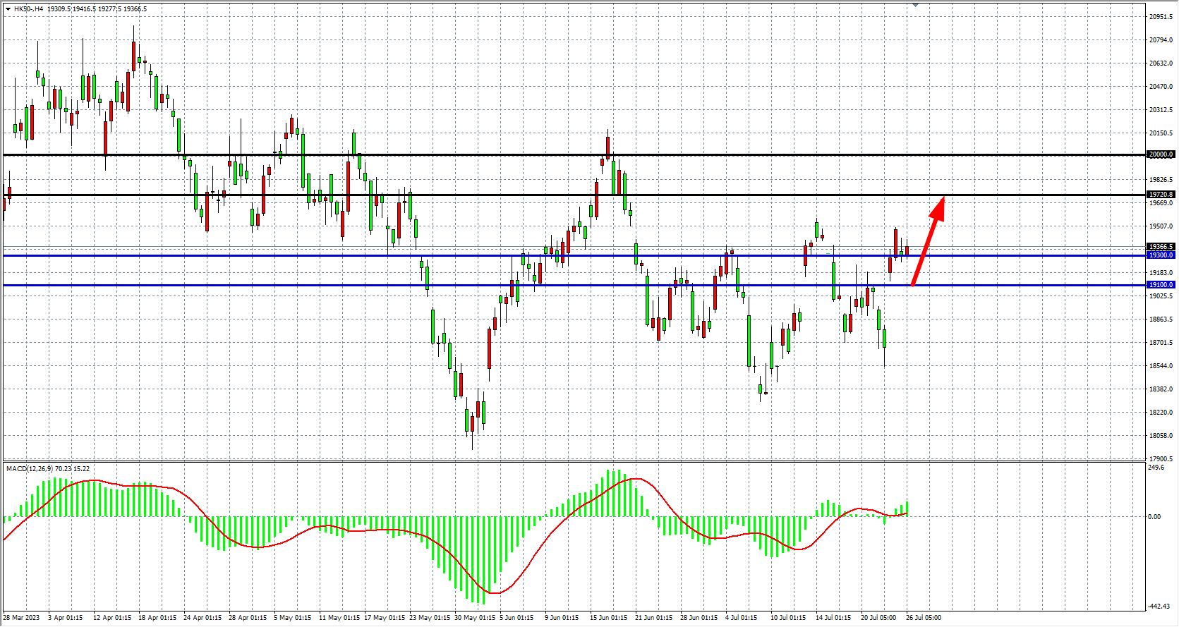 4小时图看,恒指在19350附近振幅盘整,MACD量能在零轴附近盘整,支撑关注19300关口,上方目标看19720-20000。