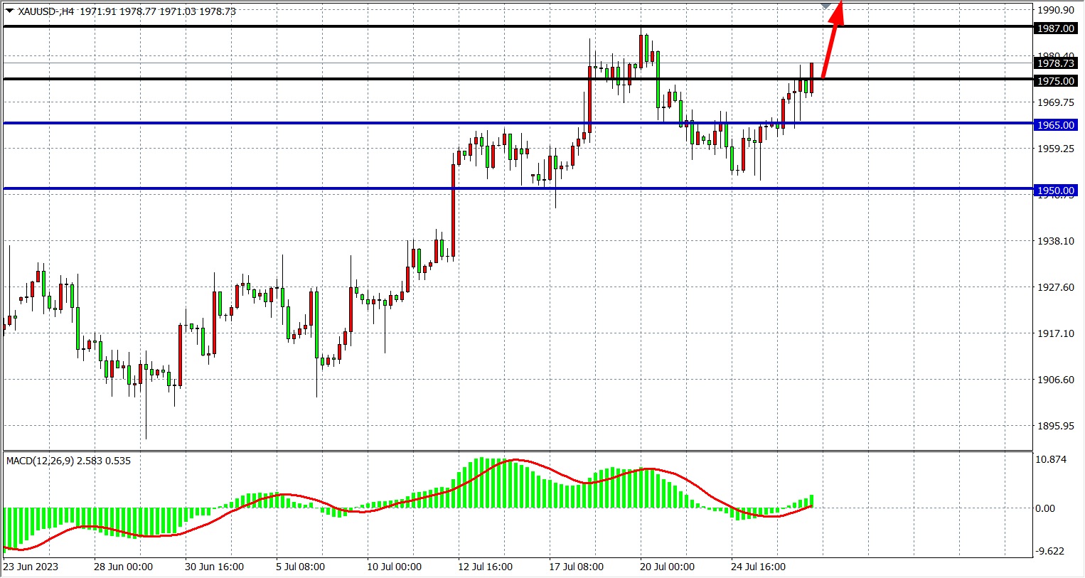 4小时图看,黄金在1950之上持续走强,MACD量能上穿零轴,支撑上移1965-1950,上方阻力1987-2000。