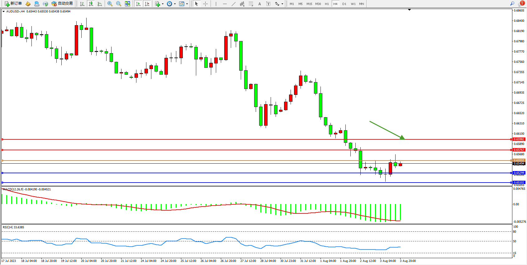 澳元美元AUDUSD——4小时K线图显示: