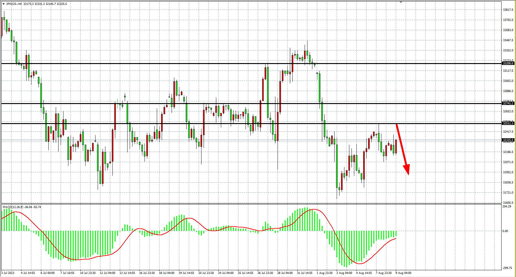 4小时图看,日经指数反弹再度受阻,MACD量能维持零轴下,趋势继续维持空头,阻力关注33250-32700。