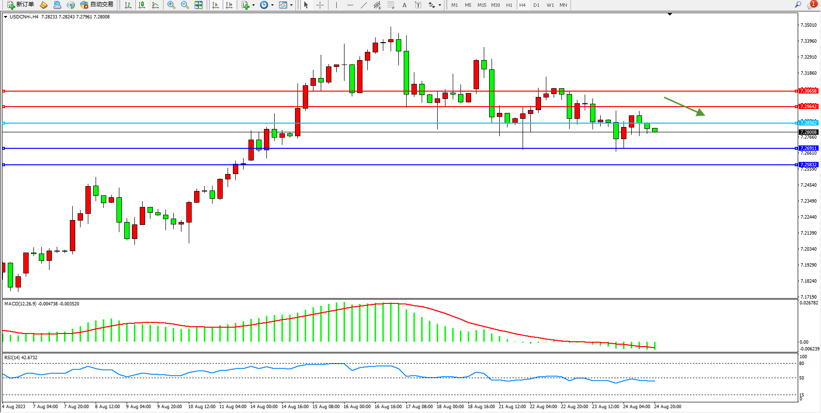 交易策略:7.28562下方看跌,目标7.26911 7.25832