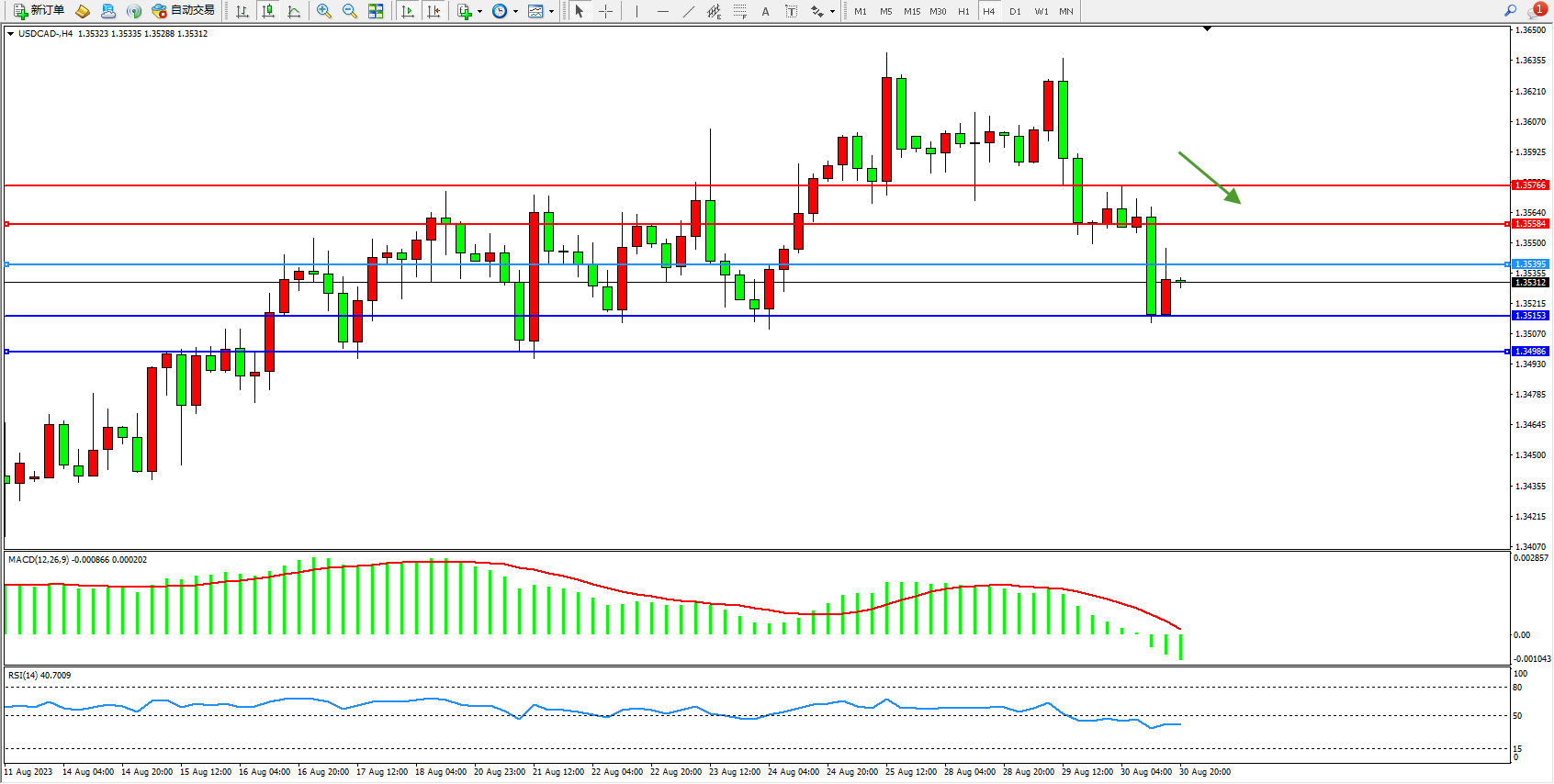 美元加元USDCAD——4小时K线图显示: