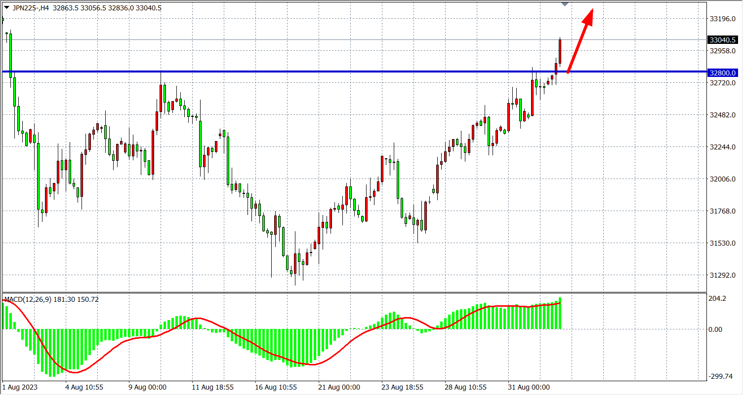 4小时图看,日经指数继续走高至33000附近,MACD量能在零轴上维持放量,支撑关注32800附近,阻力上看33300-33500附近。