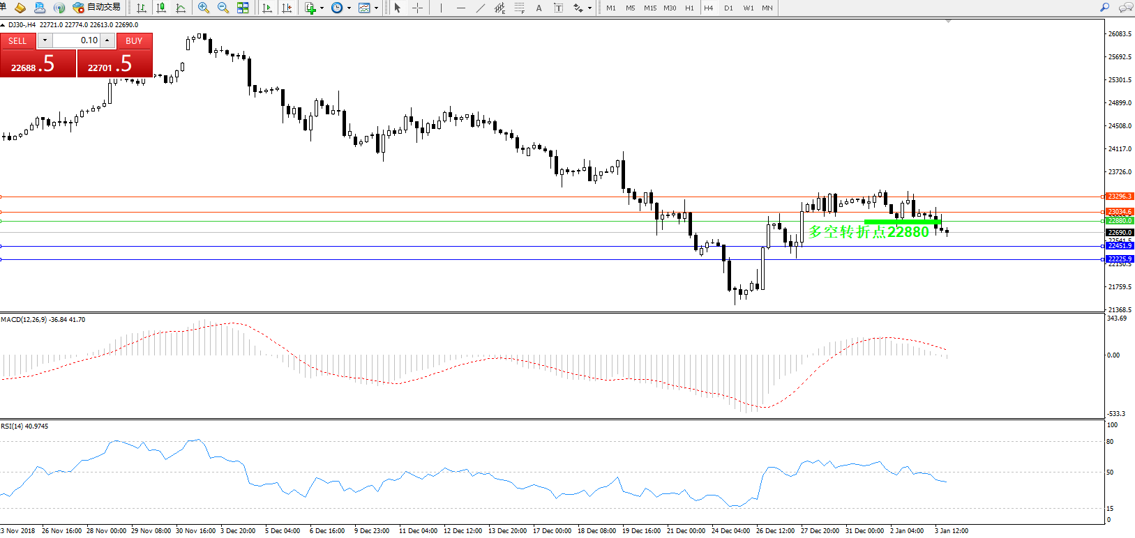 道琼斯指数DJ30—— 4小时K线图显示: