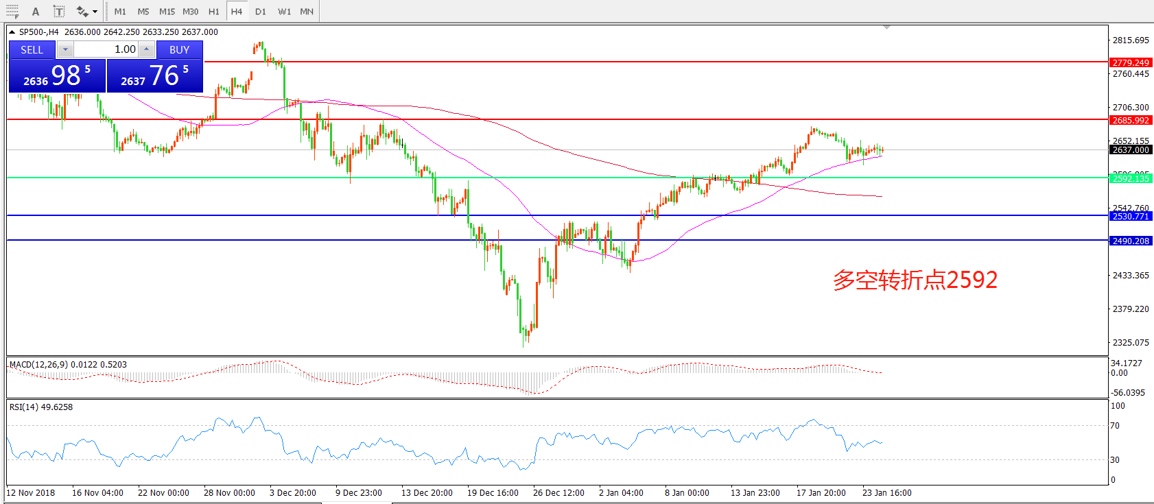 4小时图看,SP500近期逐渐站稳200周期均线,短期55均线有拐头上升迹象,MACD红柱缩短,小幅反弹成为可能。