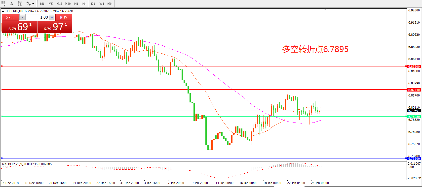 备选策略: 在6.7895之下,看跌,目标价位为6.7350,然后为6.7000