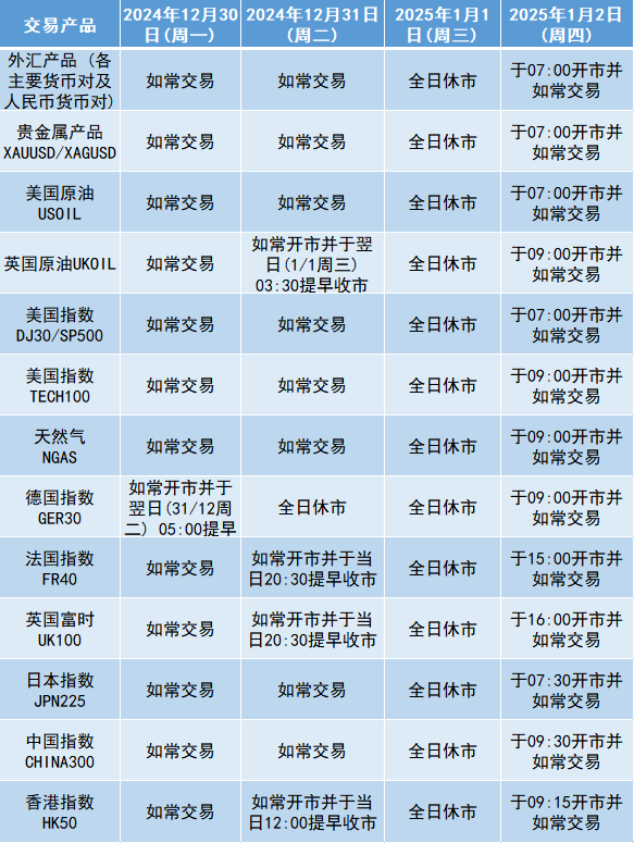 由于元旦假期影响,本公司以下产品的交易时间将于2024年12月30日(周一)至2025年1月2日(周四)作出如下安排,敬请留意。